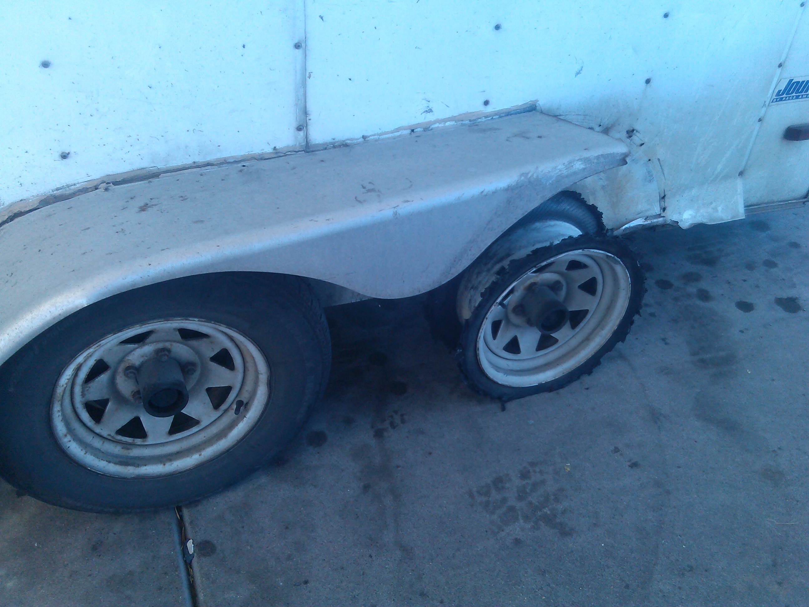 The trailer tire had blown and was completely stripped from the rim. It had been so extensive that some of the trailer paneling by the tire had started to peel away. Who knows how long we had been driving like that.
